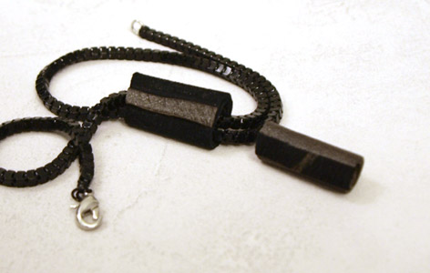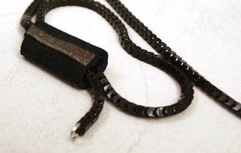 Je suis donc parti de cette chaine noir et y ai ajouté du cuir (3 couches de cuir noir sur-planté d’une fine couche de cuir gris ). Le coté pratique mais surtout sympa c’est que cet élément cuir n’est pas fixé à la chaine, du coup il vit au gré des envies, il peut cacher le fermoir, peut être enlevé facilement et peut être changé (ce bracelet a un 2ème élément de cuir fait de 2 couches de cuir noir un peu zébré de gris sur-planté de 2 fines couches de cuir gris)