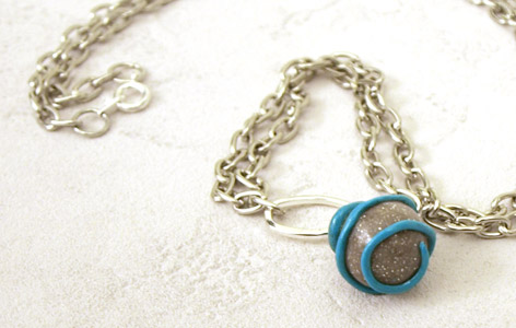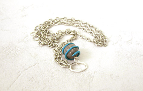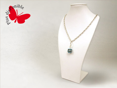 Toujours avec de la fimo (bleu et transparente pailleté). Le bleu, une couleur qui se marie à merveille avec une chaine argenté que j’imaginerai bien  sur une chemise ou un bustier noir, associé à un jean’s la journée, et un pantalon noir pour un effet des plus classe en soirée.