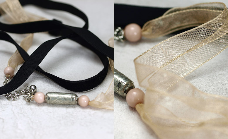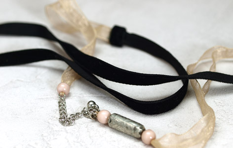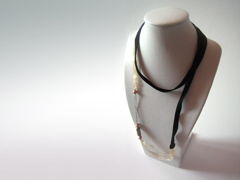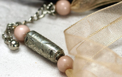 Petit effet de matière : Un mélange de soie, de velours, d’argent et de perle. Ce sautoir est un de mes premières créations. Qu’en pensez-vous?