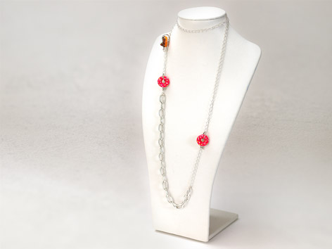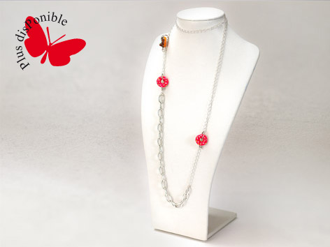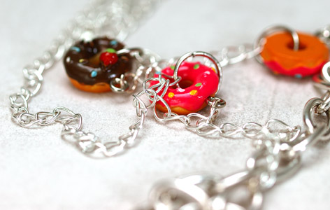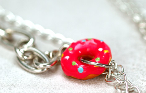 Une de mes amies est tombé sur ces breloques donuts fait en fimo, tout aussi appétissante que mignonne. J’ai donc voulu lui faire plaisir en lui confectionnant un joli sautoir argenté.