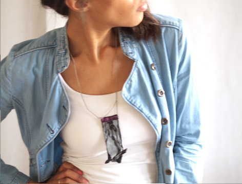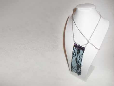 Longueur de la chaine : 63 cm, le jean brodé : 12 cm de haut Prix de vente : 35euros