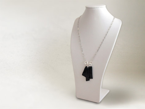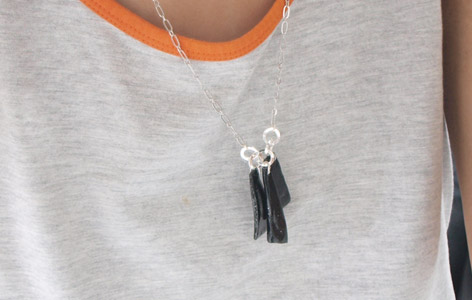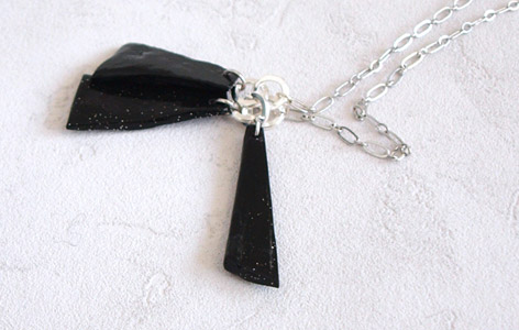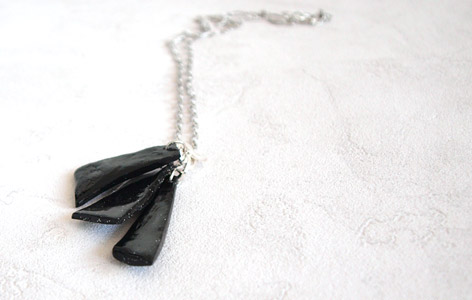Pour ce sautoir, j’ai utlisé de la chaine argenté ainsi que 2 types de fimo, de la classique noir et de la pailleté.