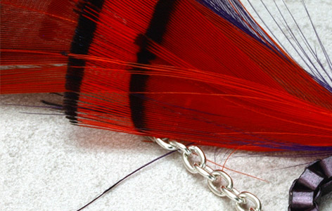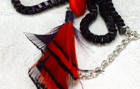 J’ai crée ce sautoir après avoir flashé sur ces 2 plumes de faisan de couleurs violet et orange, en les voyant je me suis jeté de suite dessus. Ne sont-elles pas magnifique. Tellement éclatante ^_^, qu’il n’est pas nécessaire d’en faire trop. Pour rester dans les même teinte, J’ai eu la chance de trouver une chaine et un bouton d’à peu près la même couleur, et voici ce que ça donne.