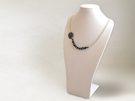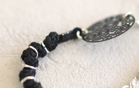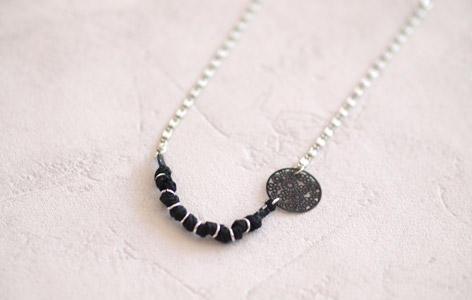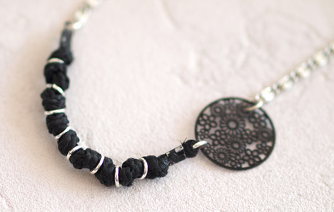 Je vous présente ma création du jour, un collier tout simple mais élégant (je pense) composé d’une fine chaine argentée plate, d’un lacet noir en coton tournicoté et enlacé de 8 petits anneaux argenté et pour finir le tout, une estampe noir fleuri.