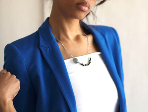 Création du jour : composée d’une chaine noire moyenne, entrelacé d’un fil de coton bleu qui est lui-même emmêlé d’une fine chaine argentée. Un sautoir qui m’a valu pas mal de boulot en fait.