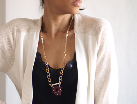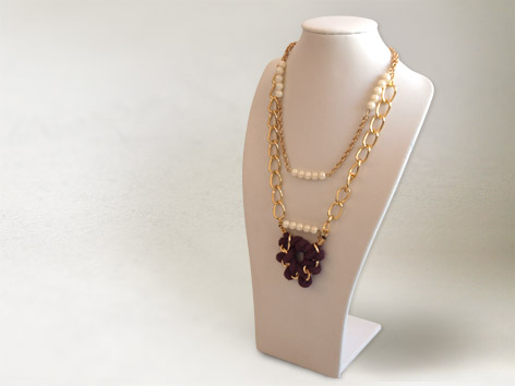 Il m’arrive de temps en temps, voir même très souvent, de partir dans une création sans forcément d’idées précise en tête, à part peut être la gamme de couleurs que je vais utiliser. Je pose quelques matières sur ma table de travail, je teste différentes compositions et lorsque le résultat me semble bien, je continu dans ma lancée ; ). Ici, la première étape a été la réalisation du pendentif, sur lequel je m’y suis repris à plusieurs reprises. Car il n’est pas très évident de réussir des nœuds avec une chaine qui n’en fait qu’à sa tête. Heureusement pour moi, j’ai réussit à dompter la bête et en voici le résultat. Qu’en pensez-vous ????