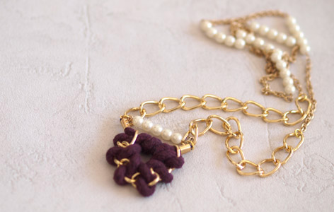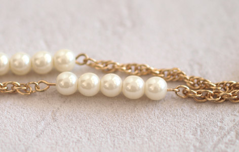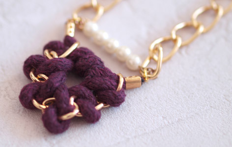 Les nœuds sont composés de cordage en coton et d’une chaine dorée (taille moyenne), que j’ai agrémentée d’une chaine dorée beaucoup plus fine et de quelques perles nacrée (30).