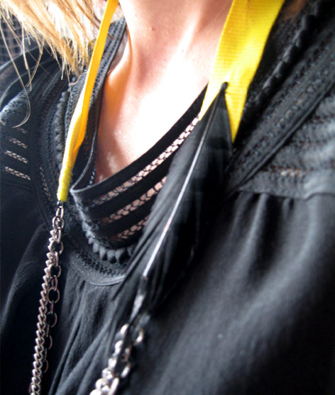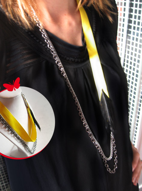 Je disais donc, pour embellir ce dernier jour de la semaine, j’ai eu envie de vous faire partager un petit verdict super cute. Celui de Sandrine (une de mes acheteuses) qui pose ici, incognito, avec son sautoir « Corbeau« .