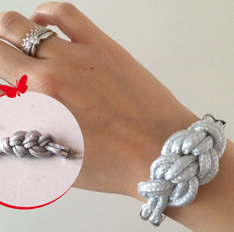 Pour se faire, j’ai utilisé deux types de lacets : du coton classique pour la partie blanche et du satiné pour la partie bleu que j’ai entremêlé d’une fine chaine argenté ovale, posé sur une chaine de bille argenté. Pour une fois trop de nœuds ne tuent pas le nœud Ahahahaha ; p