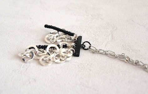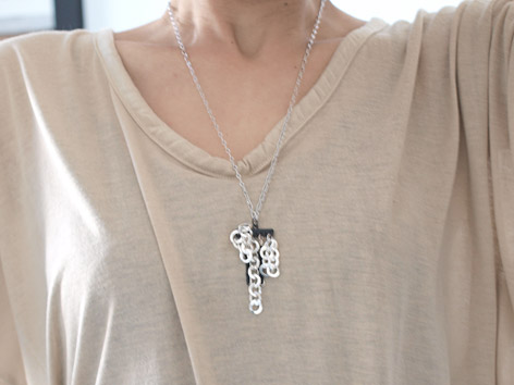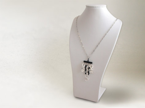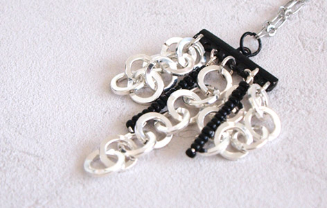 Le week-en est constructif à ce que je vois, mes idées se mettent en forme. En voici une. Inspiré par les pendentifs pharaonique que l’on voit en ce moment (rectangulaire, posé sur une longue chaine). J’ai préféré faire quelque chose d’un peu plus irrégulier, qui rend le pendentif encore plus long. Mélangé l’argenté et quelques perles noir et vous obtenez un accessoire moderne et classe à la fois.
