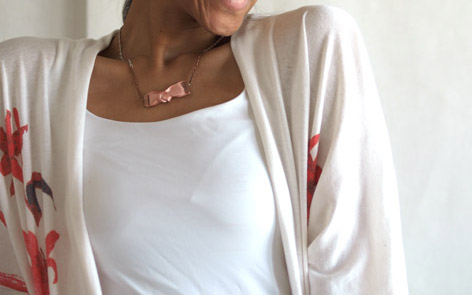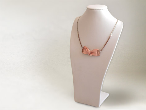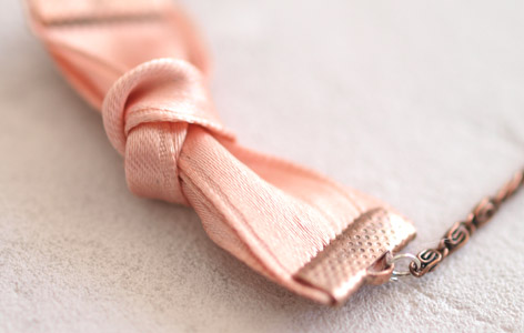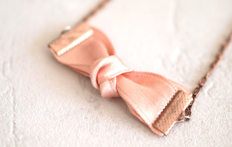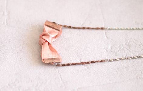 J’ai réalisé ce collier cuivré en utilisant une longue bande de soie rose nacré que j’ai plié en 3, dans le but de former un joli petit nœud fluide et élégant. Vous vous demandez peut-être, comment j’ai procédé??