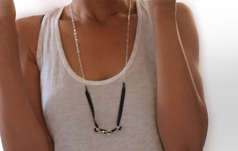 Allons-y, soyons fou : 4 matières, 4 couleurs > du jeans (bleu clair), du coton (jaune), de la soie (rose) et de la chaine (acier). Le pendentif peut être positionner n’importe où (vers le bas ou sur le coté en écusson), car le sautoir ne contient pas de fermoir. Ce qui est bien avec le mélange des couleurs dans les accessoires c’est qu’il égaille n’importe quelle tenue, un simple haut noir ou blanc et le tour est joué.