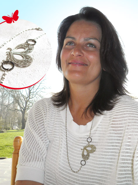 Aude n’en a pas aimé qu’un, mais 2. La voici, maintenant, avec son sautoir « Butterfly ».